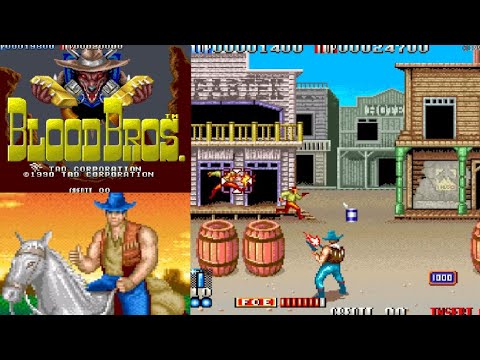 『ブラッドブラザーズ(BLOOD BROS.)』は、アーケード(AC)で1990年に稼働したガンシューティングゲーム。プレイヤーは西部劇のガンマンとなり、背面視点で敵を狙い撃ち、カバーを使い分けながら荒野の戦いを勝ち抜きます。